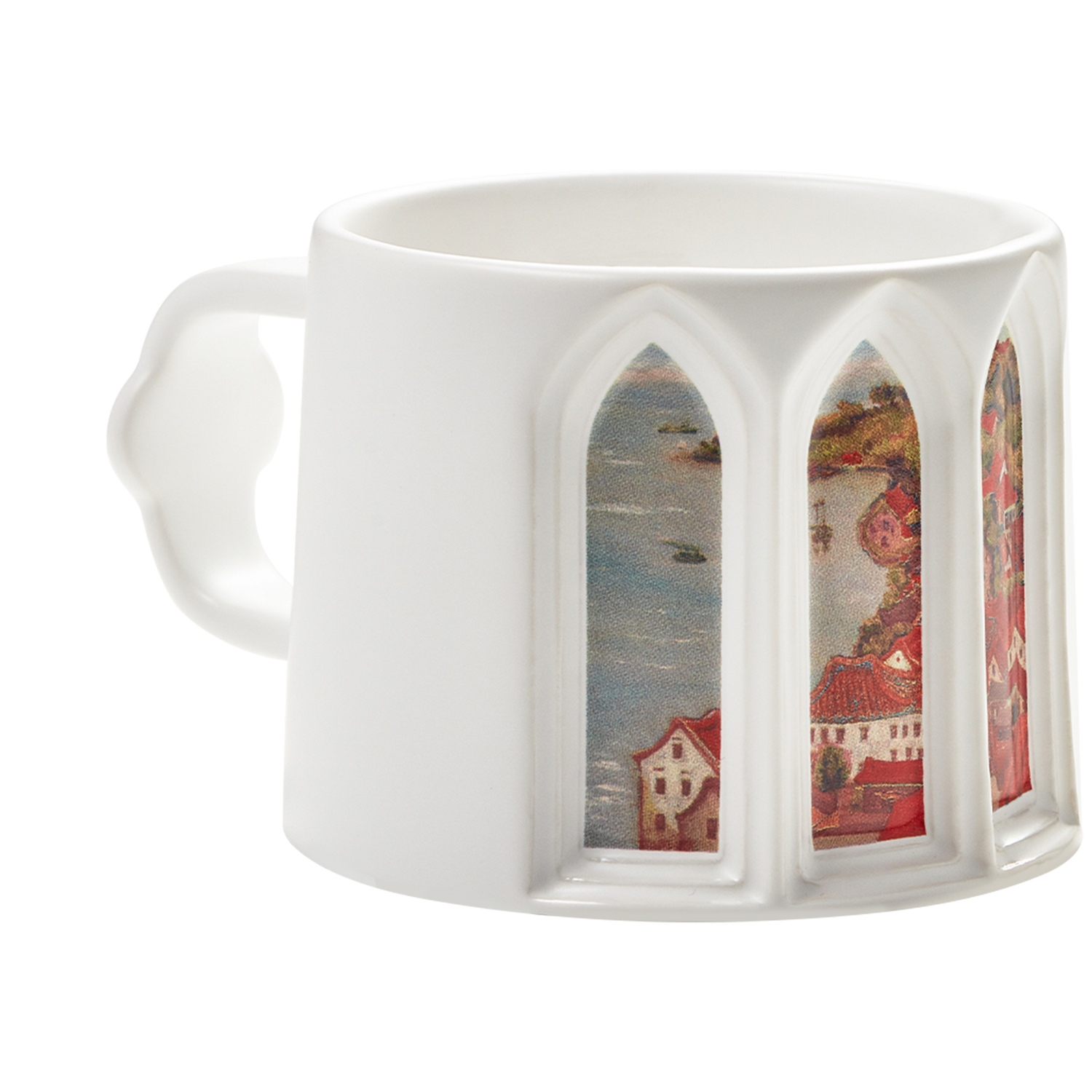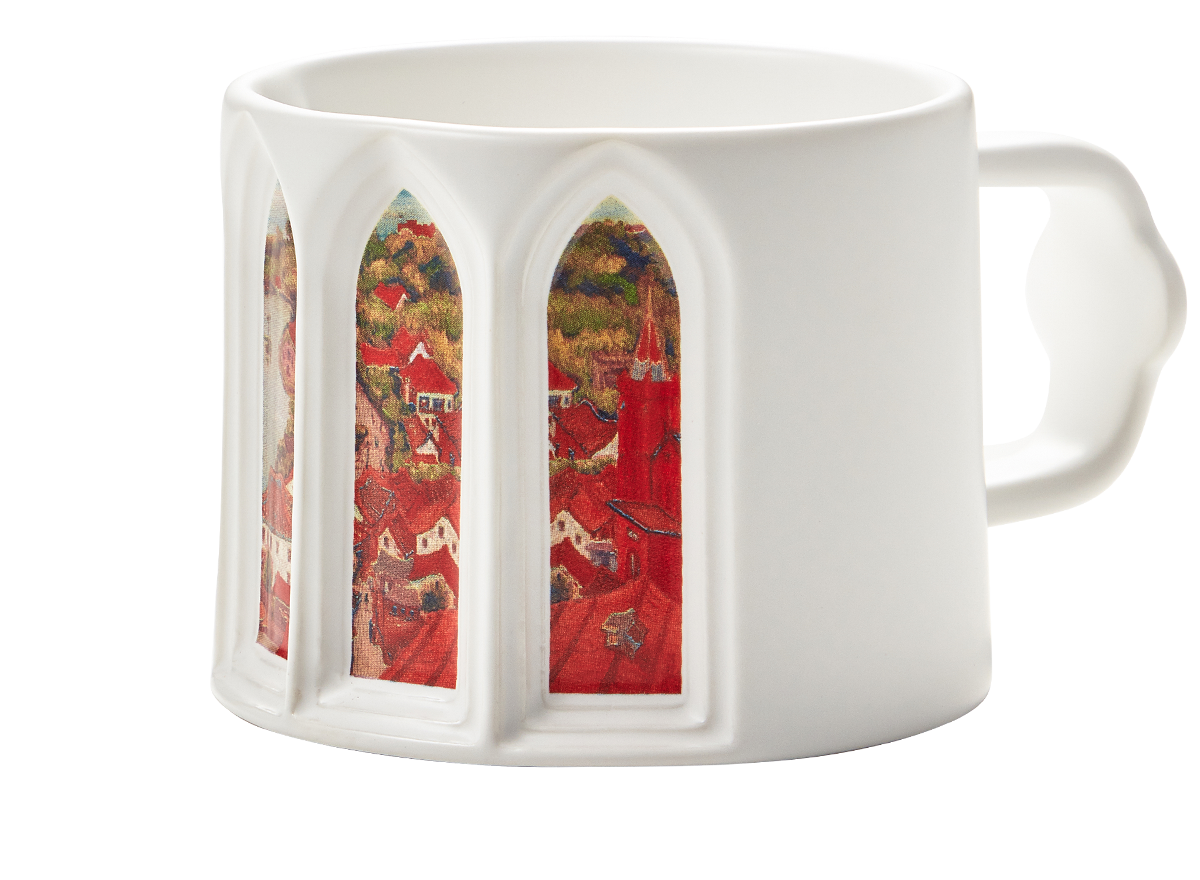The "Evening Glimmer Mug and Plate Set," inspired by Chen Cheng-Po's "Sunset in Tamsui," celebrates not only Tamsui Harbor's 160-year history but also encapsulates the artist's distinctive style, which masterfully captures the evolving cultural and civilizational landscape of his time. Chen, celebrated for documenting the zeitgeist through his art, often portrayed the synthesis of the traditional and the modern. This set pays homage to the region's Christian heritage, sparked by missionary George Leslie Mackay's arrival, and the subsequent flourishing of ecclesiastical architecture. The mug's design, with its church window silhouette, frames the vivid world beyond in a way that is reminiscent of stained glass, while the white of the mug reflects the purity of the sacred buildings. Mirroring the Nihonga technique's blend of Eastern and Western artistic principles, this porcelain set serves as a vessel of historical narrative, much like Chen's paintings, which are treasured for their vibrant portrayal of Taiwan's rich cultural tapestry.