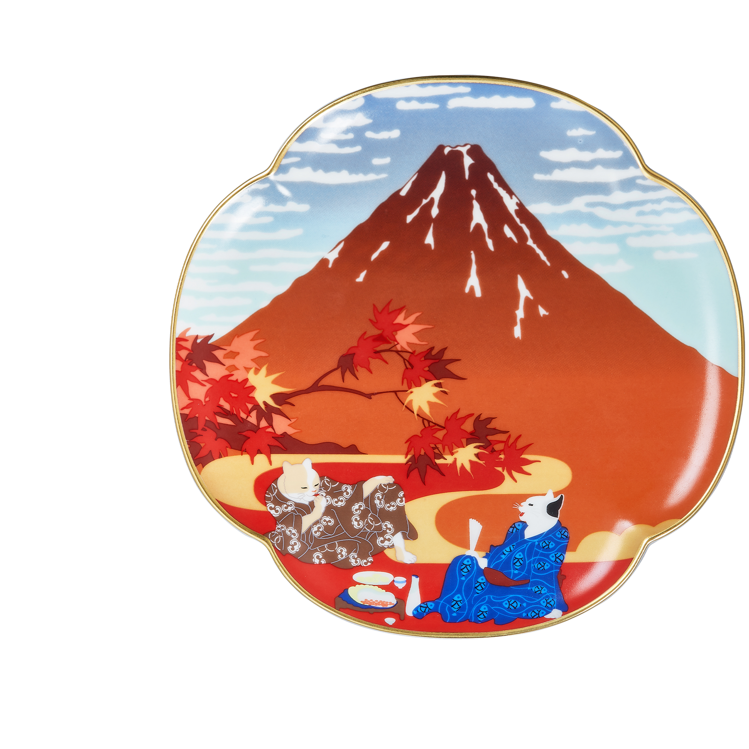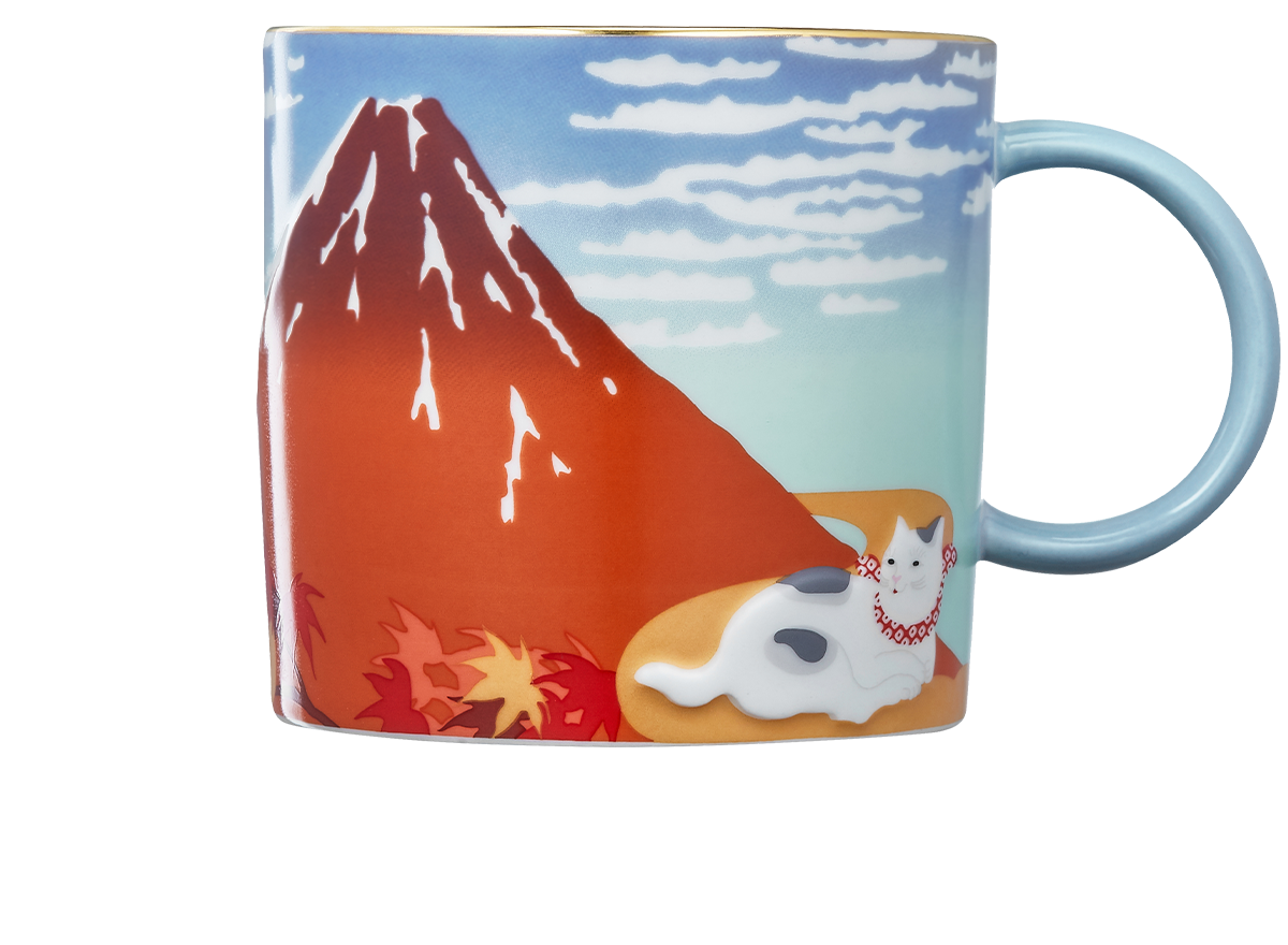 "Fine Wind, Quiet Clouds" skillfully merges the Japanese Ukiyo-e master Katsushika Hokusai's "Fine Wind, Clear Morning" with Utagawa Kuniyoshi's cat motifs to create uniquely styled mugs and plates. On these ceramics, the majestic Red Fuji is set against delicately layered clouds, forming a dazzling scene. The image of a leisurely cat, enjoying wine and admiring maple leaves in a gentle breeze, exudes charm and elegance.