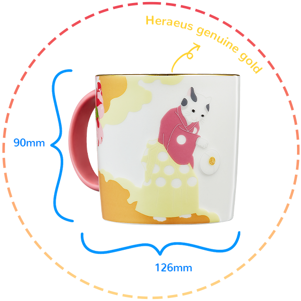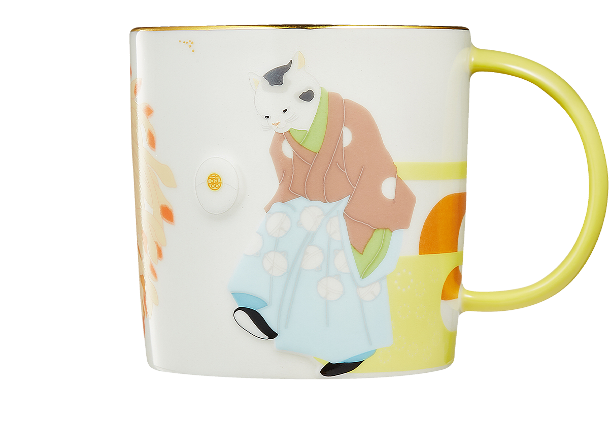These four mugs skillfully incorporate Utagawa Kuniyoshi's cat illustrations, varying from relaxed to energetic, into designs featuring red and white camellias, morning glories, pines, and chrysanthemums, each symbolizing fortune, prosperity, longevity, and joy, respectively.