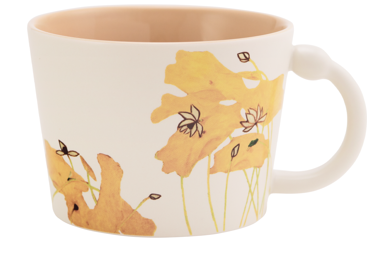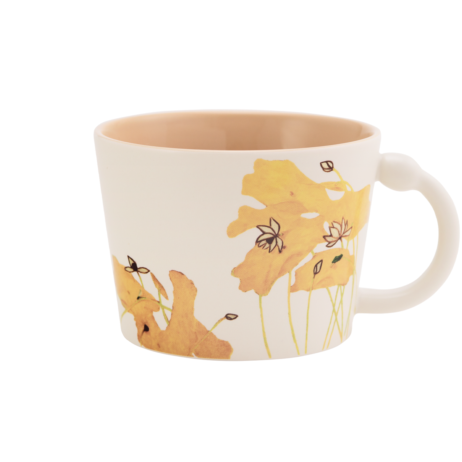 The "Lotus Splendor" porcelain mug, inspired by Sanyu’s (aka Chang Yu's) masterful depiction of lotus flowers, elegantly transforms their natural lake habitat into a continuous artistic pattern on the mug, with a handle inspired by lotus buds, combining unique visual and tactile elements into a beautifully crafted everyday item.