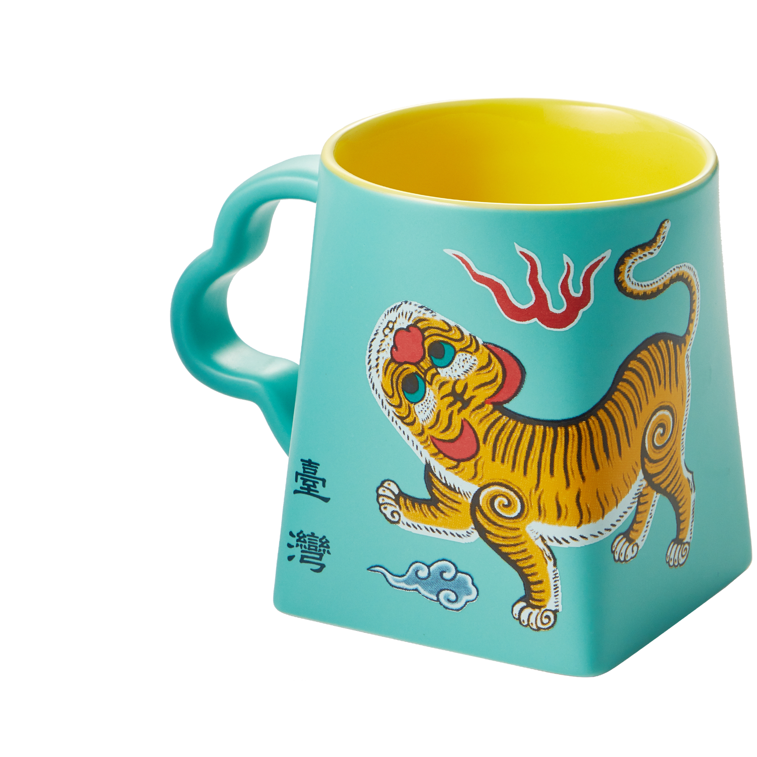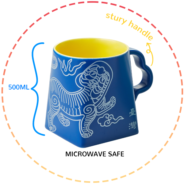 "Valiant as the Heaven" pays homage to the spirited legacy of the Republic of Formosa with its design inspired by the 1895 Yellow Tiger Flag. This mug set features a bold yellow tiger against a serene blue background, embodying the undaunted spirit and noble dignity of Taiwan through the ages. The tiger, marked with the Chinese character “王” for "king," symbolizes the island's fearless vitality amidst historical turmoil. Crafted using advanced dual-color glaze technology, this set achieves a sharp delineation between hues, enhancing the dynamic portrayal of the tiger amidst clouds, flames, and ocean waves. Lincentury's meticulous craftsmanship is evident in the matte glaze finish, offering a silk-like texture that is both visually stunning and pleasant to touch, representing a modern tribute to the resilience and enduring spirit of the Taiwanese people.
