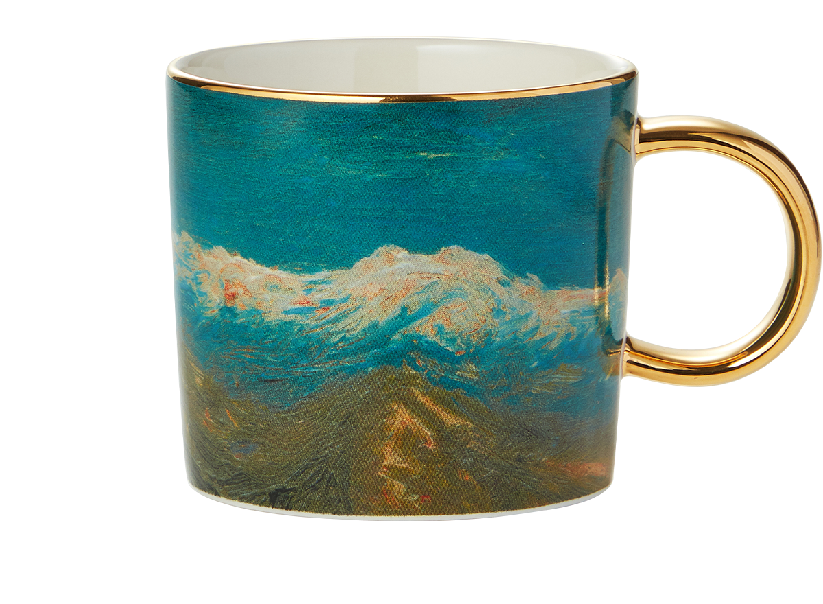 "View from Afar" transforms Chen Cheng-Po's "Accumulated Snow on Jade Mountain" into a porcelain masterpiece, capturing the essence of Taiwan's majestic Mt. Jade in elegant gilt. A tribute to the natural beauty and spiritual reverence of the landscape, this piece distills the grandeur of the mountain into a poetic, visual experience.